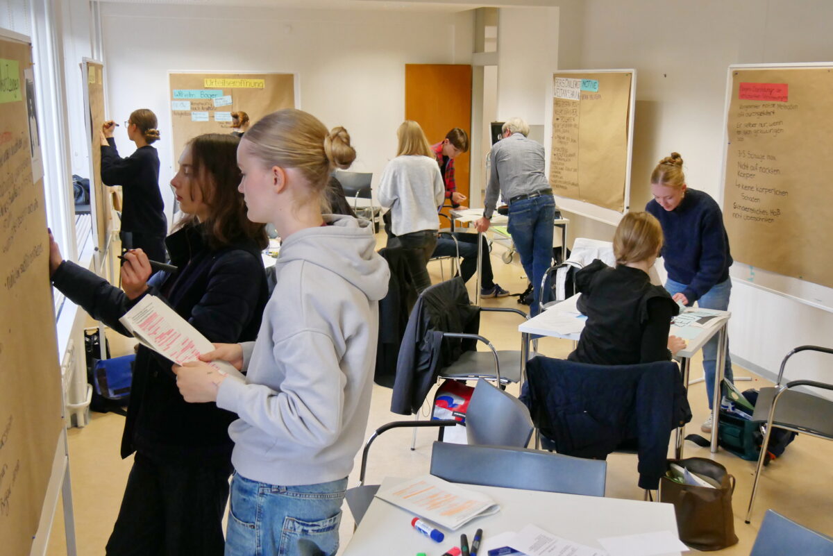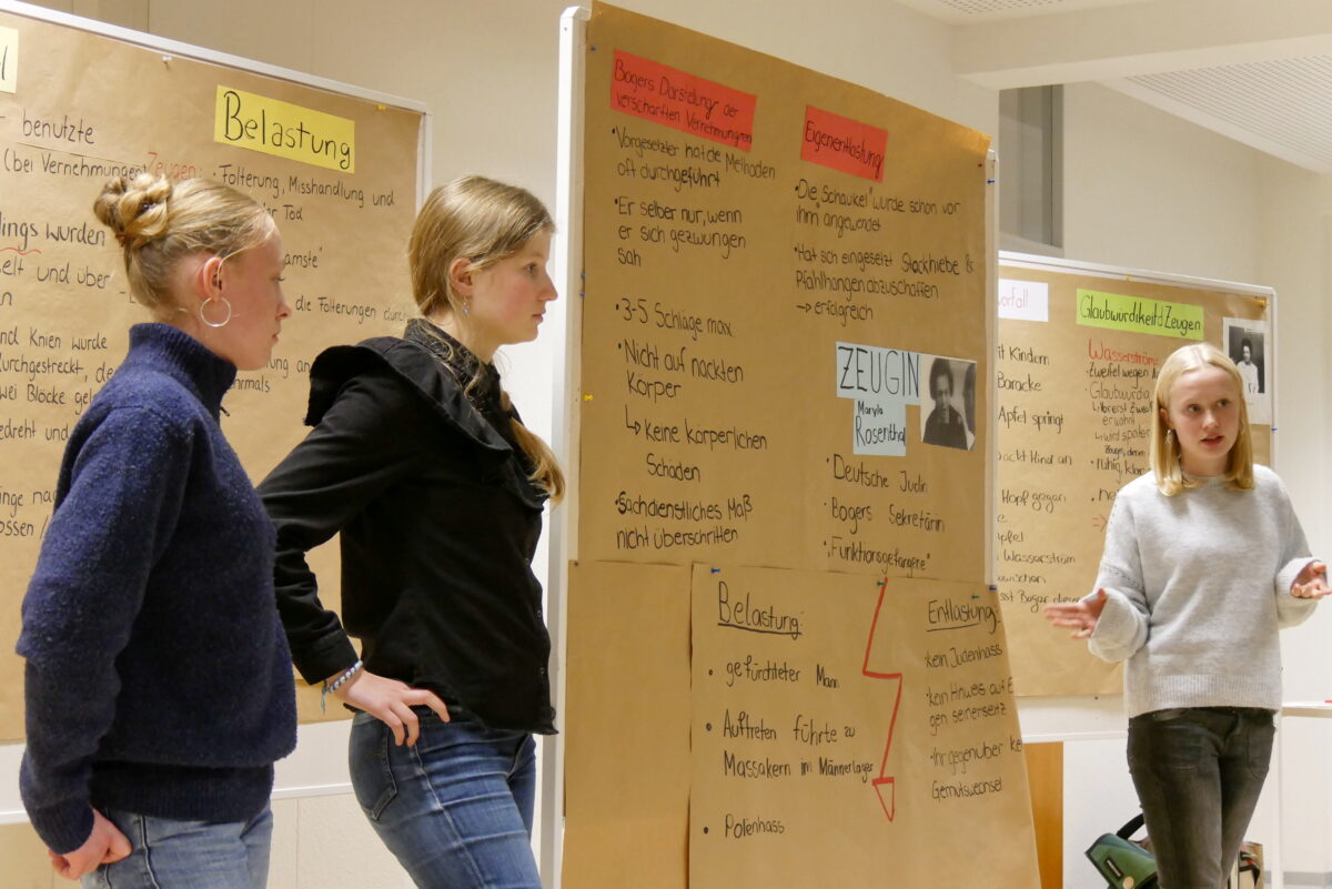 Danach bereiteten wir eine Verhandlung für den Fall Boger vor. Wilhelm Friedrich Boger war ein Nazi aus Zuffenhausen, der in Auschwitz eine brutale Verhörmethode praktizierte. Die Verhörten wurden an eine Stange durch die Kniekehlen gefesselt und mit dem Kopf nach unten aufgehängt. Während der Befragung wurden sie bis zur Ohnmacht geschlagen. Die Akten vom Fall Boger wurde auf sechs Gruppen aufgeteilt: Eröffnung, Biografie, Belastungszeugen, Entlastungszeugen, Bewertung der Zeugen und Urteil. Eine Stunde hatten die Gruppen für die Vorbereitung ihrer Plädoyers Zeit, dann begann die Verhandlung.